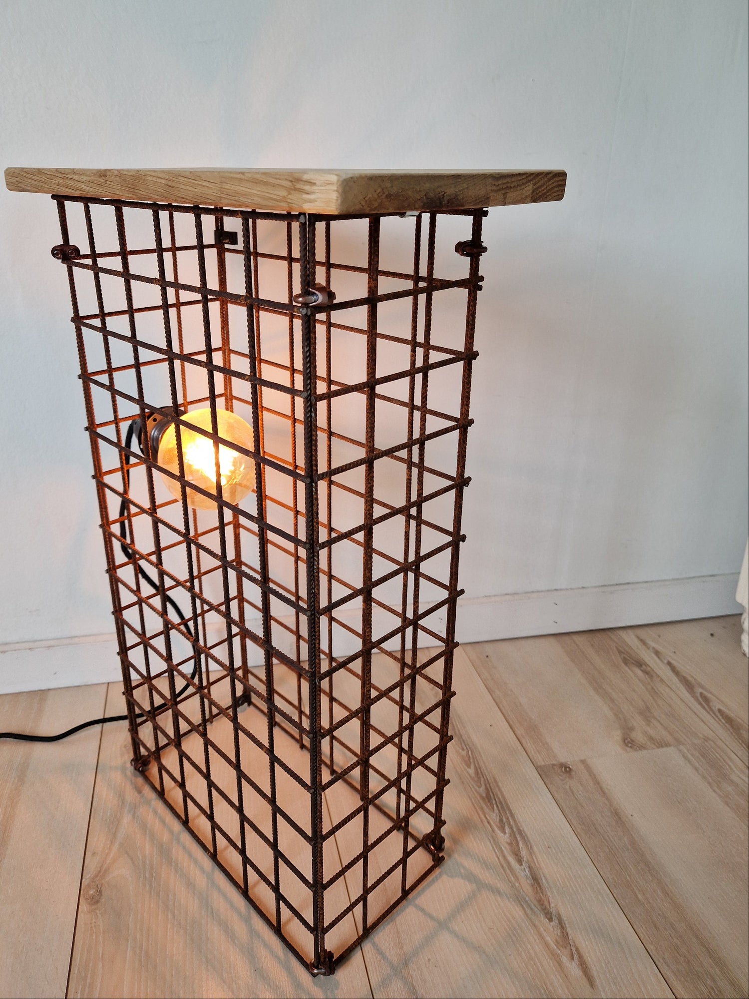 Denne elegante bordlampe er nøje håndlavet i Danmark og fremstillet af robust stålarmering & egetræ, hvilket giver den et moderne og industrielt udtryk. Lampen er udstyret med tænd sluk kontakt, elegant metalfatning samt sort ledning , der tilføjer et stilrent og tidløst udtryk.